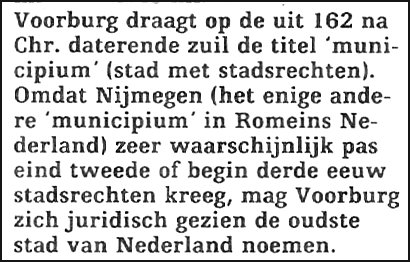 Wat schrijft prof.Jules Bogaers in 1984 in NRC van 16 juni? Zie knipsel hiernaast. Niet Nijmegen is de oudste stad, maar Voorburg en Nijmegen kreeg geen stadrecht in ca.104, maar waarschijnlijk pas in eind 2de eeuw of begin 3de eeuw. Waarschijnlijk? Er is dus nog volop twijfel en sindsdien is er niets gewijzigd door nieuwe ontdekkingen!En wat schreef Bogaers nog in BROB X-XI 1960-61, p.278? "Deze plaats van herkomst kan van de betreffende keizer stadsrecht ontvangen hebben, dus colonia of municipium zijn geworden, maar het is ook mogelijk dat de keizerlijke bijnaam enkel gefungeerd heeft als erenaam van een peregrine nederzetting!" Hier lezen we dus onverbloemd dat Nijmegen helemaal geen stadsrecht heeft gekregen van keizer Trajanus! Dat wist men in Nijmegen al in 1961, maar was dat in 2005 blijkbaar alweer vergeten! Hoe Bogaers op dat 'Ulpia' kwam dat volgens hem bij Nijmegen hoorde, lees je in Ulpia Noviomagus Bij de Romeinen was Rome de belangrijkste en enig erkende stad. Daarnaast bestonden er colonia (voor veteranen), municipia en civitas-hoofdplaatsen. Romeins Nijmegen zou toen het zo'n 6000 inwoners had, verheven zijn tot Municipium Batavorum. (Bron: Johan Hendriks). Conclusie: er is geen enkel bewijs dat Nijmegen in de Romeinse tijd stadsrechten kreeg. Het is slechts gebaseerd op veronderstellingen en aannamen en heel veel 'wishful thinking'.A.W. Byvanck (zie daar) schreef daar in 1943 al het volgende over: "Naar men aanneemt, is Traianus de eerste geweest, die aan een nederzetting in de buurt van een legerplaats stadsrechten heeft gegeven. Waarschijnlijk heeft de burgerlijke nederzetting bij het legioenskamp te Nijmegen ook stadsrecht gekregen, nadat het daar gelegerde legioen zijn vesting had verlaten. Het is evenwel niet volkomen zeker, dat de genoemde steden zich inderdaad uit de canabae der legioenen hebben ontwikkeld". Liefst vier (4) voorbehoudens ten aanzien van het zogenaamde stadsrecht van Nijmegen. Ondertitel bij de onthulling van het Trajanusstandbeeld in Nijmegen op 6 sept.1956 (zie afbeelding hiernaast): "Wij ontberen historisch inzicht". Het 'Keizer Lodewijkplein' kreeg toen de naam 'Keizer Trajanusplein'. De 'ijzersterke' tradities in Nijmegen gaan slechts terug tot 1956. Ook toen kwam er een discussie op gang rondom 'een standbeeld van Karel de Grote'. Dat kwam er pas in 1962 maar werd niet op Het Valkhof weggezet (wat de meest logische plek zou zijn, immers daar had toch zijn palts gestaan?), maar midden op het Keizer Karelplein, waar het door het druk rondrazende verkeer slechts met gevaar voor eigen leven te bereiken is. ![]() En wat schrijft J.Bogaers daar zelf over in bROB 10-11 (1960-1961)? Enkele citaten uit dit artikel over 'Civitas en stad': Dit alles lijkt mij toch duidelijke taal. Het stadsrecht van Nijmegen is slechts gebaseerd op enkele aannames en heel veel veronderstellingen. Hierbij moet wel opgemerkt worden dat Bogaers er helemaal van uitgaat dat Batavodurum en Noviomagus beide Nijmegen geweest zijn, wat slechts is gebaseerd op de onbewezen opvatting dat de Bataven tussen Rijn en Maas woonden. Maar zoals Van der Heijden opmerkte is van hen daar geen enkel spoor gevonden. Zie hier. Hoeveel zekerheid biedt dit artikel van Bogaers? Een kleine telling leert dat hij liefst 56x het woord 'waarschijnlijk' gebruikt, 30x 'wellicht', 31x 'mogelijk', 19x 'vermoedelijk', 18x wordt iets 'aangenomen' en liefst 66x 'moet' er iets, zoals in 'het moet wel betrekking hebben op'. Wat is er sinds 1943, 1959/1960/1961 (J.Bogaers) en 1981 (W. van Es, zie hierna) bijgekomen aan bewijzen? De denkbeelden uit 1943 zijn vanzelf zekerheden geworden aangezien niemand ze tegensprak. Men noemt dat in de historische wetenschap 'argumentum ex silencio' ofwel 'zonder tegenspraak zou het waar zou kunnen zijn'. Dit verschijnsel zien we te vaak in de historische wetenschap waarbij men elkaar het liefst ook niet tegenspreekt om niet als 'ondeskundige charlatan' uitgemaakt te worden wat Albert Delahaye heeft ervaren. Het 'schoenmaker blijf bij je leest' van Stolte (zie daar) spreekt dat wel uit. Welke argumenten heeft men in Nijmegen? In 1956 heeft de gemeente Nijmegen de naam van het Keizer Lodewijkplein veranderd in Keizer Traianusplein. Dit uiteraard om de aandacht op de vermeende stadsrechten van Nijmegen te vestigen die men toen gekregen zou hebben. Meerdere inwoners van Nijmegen protesteerden tegen deze naamswijziging. Hoewel de gemeenteraad niet voetstoots accoord ging is de naamswijziging toch doorgevoerd. Men zag liever de Traianus liefhebberij wat getemperd. Immers deze keizer is allerminst vriendelijk geweest tegenover de Christenen. Nijmegen was een zeer katholieke stad, waardoor het toch gevoelig lag een plein naar deze Christenvervolger te vernoemen. Een advies dat niet opgevolgd is was om "eerst maar eens een gedegen onderzoek naar deze keizer te doen om vermeerdering van de Nijmeegse raadsels te voorkomen". Schrijver dezes doelde kennelijk op het artikel over de vraag of het keizerlijk Paleis van Karel de Grote wel te Nijmegen gestaan heeft, dat enkele maanden eerder in de pers verschenen was. Er bleken toch al enkele raadsels te bestaan in de historie van Nijmegen. Opvallend is ook dat de katholieke monseigneur en pauselijke kamerheer prof.R.R.Post (zie daar) zich deze naamswijziging niet heftig verzet heeft. Het zal wel aan zijn verzet tegen de publicaties van Albert Delahaye gelegen hebben. Daar was hij al te druk mee, zodat aandacht voor deze Christenvervolger erbij inschoot. Ook hier gaven de publicaties van Albert Delahaye aanleiding de vermeende geschiedenis van Nijmegen wat op te vijzelen. Dat was in 1955 net tevoren ook gedaan rondom het bestaan van de stad dat van 700-jarig bestaan via het 1800-jarig bestaan plots het 1850-jarig bestaan werd. In 1962 zou er nog een standbeeld van Karel de Grote volgen, dat niet op het Valkhof kwam te staan (dat durfde men toch niet aan), maar weggestopt werd op het Traianusplein, schier onbereikbaar door het steeds drukker ro