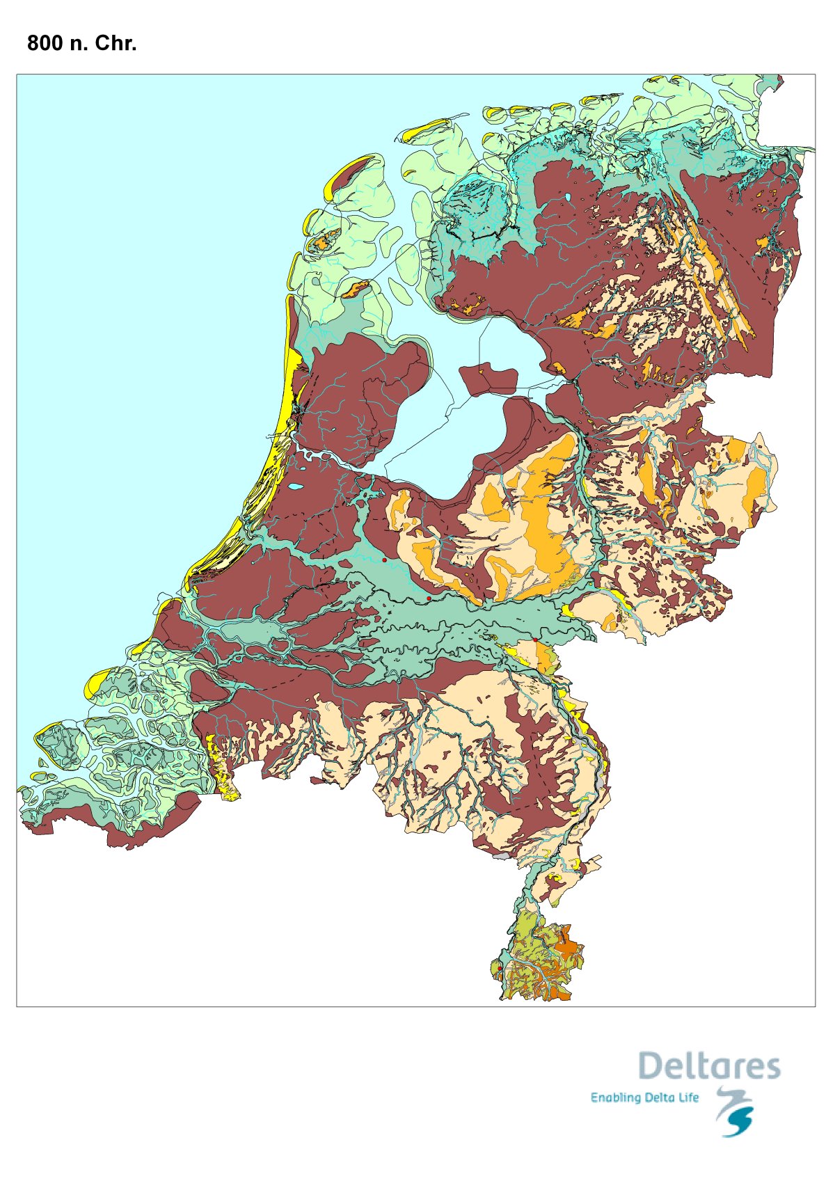 Onderaan: de Paleogeografische kaart van Nederland uit c.800 n.C. Deze kaart is onderdeel van het programma Kenniskaart archeologie van de Rijksdienst voor het Cultureel Erfgoed. Binnen dit project wordt een begin gemaakt met archeologische verwachtingskaarten in lagen. Het streven is om op deze kaarten archeologische resten in de Nederlandse bodem uit te splitsen naar periode en diepte. De verbeterde paleogeografische kaarten zijn één van de bronnen die voor Verwachtingen in lagen gebruikt gaan worden. Ze zijn vervaardigd door P.Vos en S.de Vries van Deltares. Bronvermelding: Vos, P. & S.de Vries 2013: 2e generatie palaeogeografische kaarten van Nederland (versie 2.0). Deltares, Utrecht. en Vos, P. in prep: Palaeogeographical maps of the Netherlands, Chapter 2: Compilation of the Holocene palaeogeographical maps of the Netherlands. Utrecht. Beide afbeeldingen op 9-12-2017 gedownload van www.archeologieinNederland.nl. Klik op de kaart voor een vergroting. De legenda geeft een toelichting op de kleuren van de kaart. Lees het boek "De Ware Kijk Op" en oordeel zelf. |