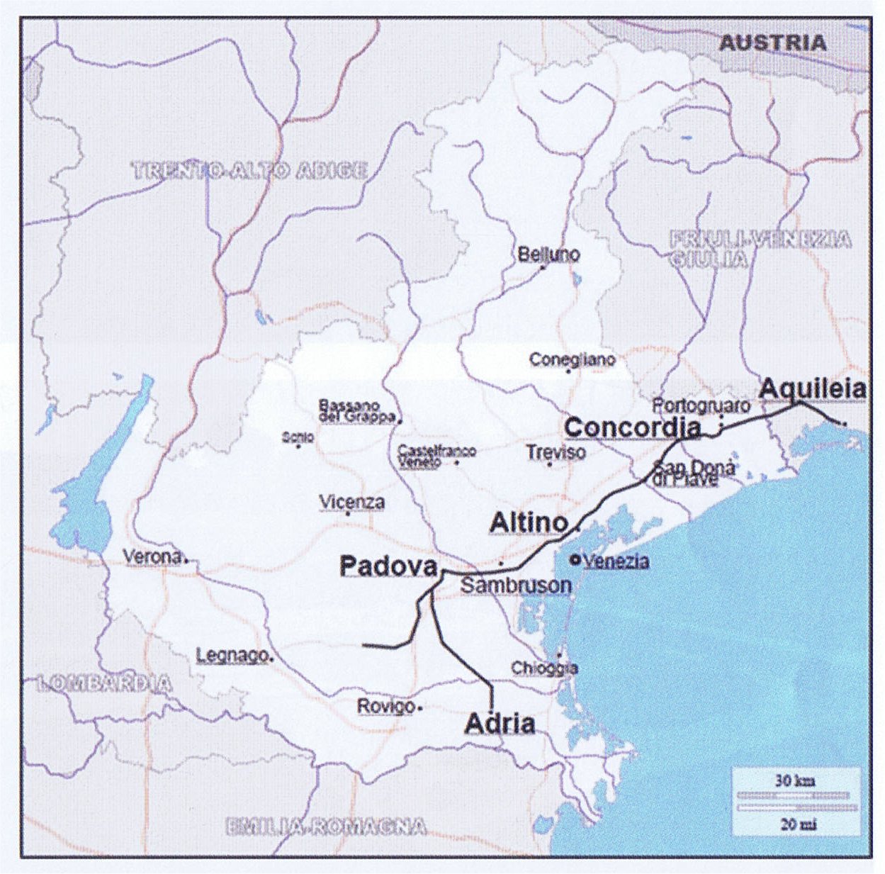Hoewel er nog veel onduidelijk is over de precieze loop van de antieke Via Annia, heeft archeologisch onderzoek in de afgelopen jaren veel nieuwe informatie opgeleverd over deze vanaf 131 v.Chr. in het noordoosten van Italië aangelegde Romeinse weg. Rénie van der Putte en Joost Vermeulen volgden het vermoedelijke tracé van de Via Annia van haar begin in Adria aan de Adriatische kust tot aan Aquileia in het uiterste oosten van de golf van Venetië. Zie kaart hiernaast.