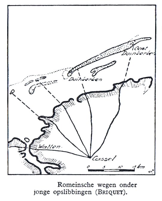 Wat verkleuringen in de grond, een enkele laagje grint en in het beste geval nog een paar verrotte balken in een eindeloze hoeveelheid klei. Als je puur naar de resten kijkt, zou je je kunnen afvragen: waar maken we ons nu eigenlijk zo druk over? Waarom al die ophef over een handvol steentjes? Het zijn zeer terechte vragen die Van der Heijden hier zelf stelt op p.6. Ondertussen is men wel druk doende die handvol steentjes op de lijst van Werelderfgoed van de Unesco te krijgen. Als dat lukt staat archeologisch Nederland (en de Unesco) volkomen in hun hempjes. Die zijn dan niet langer serieus te nemen. Immers van Romeins Nederland is niets meer zichtbaar dan wat nagebouwde uiterlijkheden op niveau van het 'pretpark' Archeon. In Archeobrief 1 van maart 2011 is Paul van der Heijden wel openhartig over die Romeinse wegen. Tussen de 71 stukken en stukjes gevonden weg blijken er grote verschillen te bestaan in breedte, opvulling, verharding, wel of geen greppels, ofwel er is totaal geen sprake van eenduidigheid. Geen twee stukken blijken aan elkaar gelijk waar geen Romeinse standaardisatie uit spreekt, waar de Romeinen toch wel om bekend staan. Waren het wel allemaal 'Romeinse' wegen? De gevonden stukken vormen ook geen doorlopende weg, hoewel die indruk wel wordt gewekt op de erbij getoonde kaartjes. Het is overduidelijk dat de zogenaamde Romeinse Limes in Nederland nooit iets heeft voorgesteld. Het is precies zoals archeoloog W.A. van Es (zie daar) het in 1981 al omschreef: "Het Romeins in Nederland is allerminst van internationale allure geweest". "Romeins Nederland is nimmer de eer van een colonia waardig geacht!" Daar is ondertussen niets nieuws bijgekomen, ook in dit boek niet gezien de literatuurlijst die loopt van 1884 tot 2014. Opvallend is wel dat juist dit boek van Van Es, maar ook dat van A.W.Byvanck (zie daar) en Albert Delahaye niet in de literatuurlijst voorkomen. Opvallend? Neen, Van der Heijden c.s. vermijden precies de boeken die hun opvattingen tegenspreken. Toch moeten ze soms erkennen dat de traditionele opvattingen ook niet kloppen. Met veel uitweidingen wordt dan om de hete brij heen gepraat. De voorbeelden hieronder maken dat wel duidelijk.  De visie van Albert Delahaye. Wat voor alle duidelijkheid benadrukt moet worden is dat Delahaye geen moment twijfelt aan de aanwezigheid van de Romeinen in Nederland, wat de Romeinse relicten wel aantonen. Ook hebben de Romeinen hier zeker wegen aangelegd en in dit drassige gebied op allerlei manieren verstevigd. De wegen worden niet ontkend, maar zijn dit de wegen van de Peutingerkaart? Ook de plaatsnamen die van diezelfde Peutingerkaart komen, zijn voornamelijk gebaseerd op een oppervlakkige klankovereenkomst. Het blijkt nog steeds een onbewezen veronderstelling te zijn, een hypothese. Zeker nu bewezen is dat de Peutingerkaart een falsum is, is er geen enkel bewijs dat de Nederlandse traditie juist is. Zie bij Peutingerkaart. Waar in Nederland vind je het Septemvium, een kruispunt van Romeinse wegen waar Trajectum en Lugdunum deel van uitmaakten? Overal waar de Romeinen verschenen legden zij wegen aan, zeker in drassige gebieden zoals in Nederland. Frappant is het wel dat van die wegen die er beslist geweest zijn, zo weinig wordt teruggevonden. Ook de verschillen in die wegen geeft al aan dat deze niet aangelegd zijn in een uniformiteit die kenmerkend is in het grote Romeinse Rijk. Ook de uitvoeringen van Romeinse kampen en wachttorens in Nederland blijken erg verschillend. Van de zuidelijke weg die door de Patavia gelopen heeft en die in Nederland geprojecteerd is, is al helemaal niets teruggevonden (wat in dit boek ook erkend wordt (p.33-39). Daardoor wordt de hypothese al tot 50% gereduceerd. Op het verblijf van de Romeinen in Nederland is de term 'Agri Decumatis' van toepassing. Letterlijk vertaald betekent dat 'de drooggevallen gronden'. Tacitus beschrijft het zo (Germania 29): 'Onder de volken van Germania mogen we hen niet tellen, die zich hebben gevestigd aan de overzijde van de Rhenus en de Danuvius en daar de "Agri Decumates” bezetten. Het schuim van Gallia, en allen die de miserie tot dit waagstuk had gedwongen, hebben een land ingenomen waarvan het bezit onzeker was. Daarna heeft men een grensweg aangelegd, hier en daar enige legioenen gelegerd, en zo zijn zij een vooruitgeschoven punt van het rijk en deel van een provincie geworden'. Deze tekst van Tacitus spreekt de traditionele opvatting op een onmiskenbare wijze tegen. Deze tekst is altijd volledig misverstaan doordat men Renus en Danuvius met de Rijn en Donau vereenzelvigde en men de Agri Decumates in zuidwest Duitsland plaatste. Maar daar is geen sprake van drooggevallen gronden waarvan het bestaan onzeker is. Het gaat hier duidelijk om het waddengebied aan de kust van het Kanaal, onderhevig aan overstromingen, precies zoals het door Plinius beschreven is. De Duinkerkse transgressies zijn er over- en overbekend en heten niet voor niets Duinkerkse transgressies. En Germania? Germania was het gebied ten noorden van Gallia, waarvan Boulogne-sur-Mer de hoofdstad was volgens Orosius. Zie bij Germania. En juist in dit gebied waar je de overkant kunt zien, stak Julius Caesar over naar Engeland, woonden de Bataven en kwam Willibrord in 690 aan op het vasteland. |