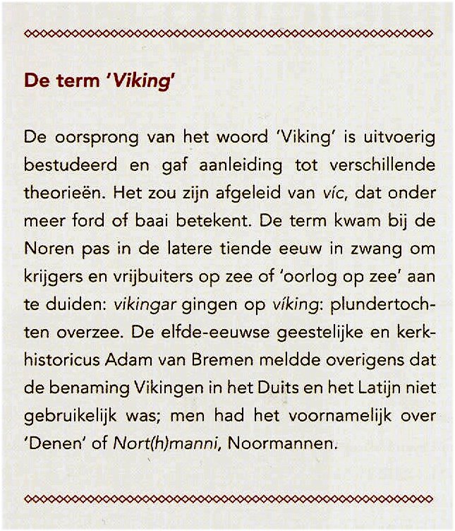 ![]() Meer over vastgeroeste tradities en achterhaalde opvattingen die in dit boek aan de orde komen, leest U verder naar onderen. Toch geeft het boek ook opmerkelijke informatie, zoals over de term 'Viking'. Het blijkt dat deze term pas uit de late 10de eeuw (of zelfs 11de) eeuw te stammen. Zie kader hiernaast. De in deze tekst genoemde Adam van Bremen is de grote vervalser van de mythe van St.Anscharius. Lees meer over Adam van Bremen en lees meer over Anscharius. Adam heeft ook terecht vastgesteld dat de term 'Vikingen' in het Latijn of het Duits niet voorkomt. Dat het Duits in zijn tijd al bestond is overigens ook een mythe. Lees meer over het Diets. De grondfout die ook Kuipers niet doorziet is dat men Frisia op het Nederlandse Friesland projecteert, terwijl het over het gebied van de Fresones in Frans- en Belgisch-Vlaanderen handelt. In Friesland is van plunderingen door de Noormannen/Vikingen nooit iets gebleken. Overigens ook in Utrecht, Deventer, Zutphen of Nijmegen niet. Wie woonden daar in de 9de eeuw met rijke bezittingen die het plunderen waard waren? Deze plaatsen bestonden nog lang niet in de 8ste/9de eeuw. Welke kloosters bestonden er in die tijd en geplunderd werden? Het oudste klooster in Utrecht was de Paulusabdij uit 1050 en toen was er van Vikingen geen enkele sprake meer. Kuipers geeft wel duidelijk aan wat hij onder de termen 'Nederlanden' of 'Lage Landen' verstaat (p.15). Bij anderen is het maar gissen wat zij onder 'de Lage Landen' verstaan, zoals bij Tom Buijtendorp en Luit van der Tuuk. Bij Kuipers is dat het geografisch bereik van Sleeswijk en Oost-Friesland tot Normandië en Parijs, ook het ruimere Rijnland en de Maasstreek rekent hij ertoe. Dat is wel erg ruim bemeten, dus ergens zal van het hele verhaal wel iets passen, maar helaas niet in de huidige Nederland. Daar is van Vikingen, of beter Noormannen, geen spoor gevonden, ook cultureel of wat betreft taalrelicten niet. Geen enkele tekst noemt duidelijk dat de Noormannen ergens in Nederland aan het plunderen zijn geweest. Wat viel hier te plunderen waar geen steden en geen kloosters waren en het land zo goed als onbewoond was. Jacob van Oudenhoven schreef daar in de 17de eeuw het volgende over: "het ontbreken van elke schriftuur, geen enkel geschrift over de geschiedenis van Holland omdat het land niet bewoond was". Jacob had het goed begrepen. Is het dan niet opvallend dat alles dat wij menen te weten over de oudste geschiedenis van ons land in buitenlandse, vaak Franse kronieken staat? Zouden die Franse kroniekschrijvers de geschiedenis van een ver onbekend land hebben beschreven en hun eigen geschiedenis onbeschreven hebben gelaten?