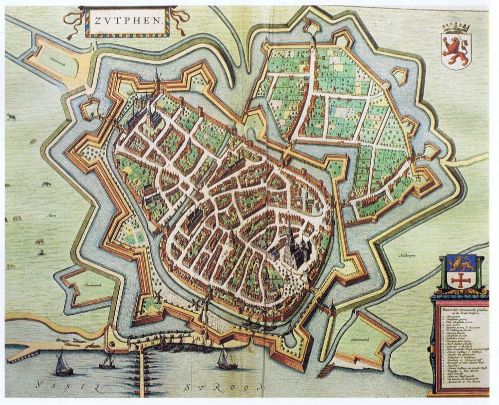 Hoe kwamen de historici op die aanval op Zutphen in 882? Het blijkt op een dubbele cirkelredenering gebaseerd te zijn. In 882 wordt Taventri genoemd, dat opgevat werd als Deventer. Ook wordt bij plunderingen door de Noormannen de Isla genoemd, dat opgevat werd als IJssel. Als de Noormannen Deventer aan de IJssel geplunderd hebben, kwamen ze langs Zutphen dat ze dan ook wel zo uitvoerig geplunderd zullen hebben dat er niets van terug te vinden is. Waar die Noormannen dan vandaan kwamen blijft een raadsel. Vanuit Kampen? Maar daar is van plundering niet te vinden. Vanuit Arnhem? Ook daar is van plunderingen nooit iets gevonden. Blijkbaar hadden de Noormannen en uitstekende opruimploeg zodat we van die plunderingen nooit iets hebben gevonden. Je zult het niet geloven, maar dit stelde de historici F.Hugenholtz (citaat 27) en W.A. van Es (citaat 6) ooit met een stalen gezicht over het ontbreken van sporen van plunderingen door de Noormannen in Nijmegen en in Wijk bij Duurstede. De geschiedenis van Zutphen is vergelijkbaar met die van Nijmegen. In Nijmegen werd altijd aangenomen dat er een Paleis van Karel de Grote had gestaan. Toen dat eens onderzocht werd, het was nooit met feiten aangetoond, bleek het een mythe. Dat is nu na 50 jaar wel geaccepteerd (op enkele fanatieke historici na). Lees meer over Nijmegen. In Zutphen wordt nu beweerd dat de Noormannen er geplunderd hebben. Dat is ook nooit met feiten aangetoond. Ook hier ontbreekt elk bewijs voor die opvatting. Ook hier zal het wel 50 jaar duren voordat het algemeen geaccepteerd wordt. "Het door Groothedde geschetste beeld dat Zutphen het bestuurlijke centrum was van waaruit de fiscale domeinen werden beheerd, en Deventer het kerkelijke centrum en de handelsplaats, zou kunnen worden genuanceerd. Ook in Deventer lagen koninklijke domeinen met belangrijke, hieraan verbonden koninklijke rechten. Wel is het zo dat er bij de burcht van Zutphen niet direct een verstedelijkende nederzetting lag. Die ontwikkeling vond pas in de loop van de 12e eeuw plaats en tot die eeuw was Deventer het enige (proto)urbane centrum in deze regio". (Bron: Jeroen Bouwmeester, in Westerheerm speciaal 2014, met verwijzing naar Groothedde, 2011). Niet direct..., ofwel: Zutphen ontstond als -verstedelijkte- nederzetting (stad?) pas in de 12de eeuw. Het grote probleem in de geschiedenis van Zutphen is dat de premisse onjuist is, waardoor ook alle deducties onjuist zijn. De premisse, het uitgangspunt, is de vermeende aanwezigheid van St.Ludger in Zutphen. Maar St.Ludger is nooit in Zutphen geweest. In zijn tijd bestond Zutphen niet eens. Het is dezelfde mythe als zou Ludwig von Beethoven er geboren zijn. Ook daar is geen enkel bewijs voor. Zo komt Zutphen wel aan haar geschiedenis. De geschiedenis van Zutphen kan met minstens 4 eeuwen ingekort worden. In Zutphen hanteert men de volgende jaartallen om haar geschiedenis aan op te hangen: ca.780 (abdis Walburga), 882 (de vermeende aanval door de Vikingen), 1059 (een valse oorkonde), 1101 (twijfelachtige oorkonde van Otto van Sutphem), ca.1195 (moet zijn 1210: de verlening van stadsrecht). Tussen 780 en 882 (meer dan een eeuw!) heeft men niets, net als tussen 882 en 1101 dan alleen een valse oorkonde. Dat zijn tussen 780 en 1101 ruim 3 eeuwen zonder bewezen geschiedenis. In de oorkonden uit het jaartal 882 komt de plaatsnaam Zutphen overigens niet voor. Pas in 1195 komt er enige zekerheid in de geschiedenis van Zutphen. Tussen 780 en 1195 zitten ruim 4 eeuwen met een twijfelachtige en onbewezen geschiedenis. Kortom: de geschiedenis van Zutphen begint pas aan het eind van de 12e eeuw, net als zoveel andere plaatsen in Nederland. Zutphen is daarop geen uitzondering. De oudste vermelding van Sutphen stamt uit de 12e eeuw. (Bronnen: Lexicon van Nederlandse toponiemen en Nederlandse plaatsnamen). In 1654 heet het stadje nog Zutveen, waarin het 'veen' duidelijk aangegeven is. Zutphem kreeg haar naam dus vanuit het noorden, dus eerder vanuit Deventer dan vanuit Doesburg.