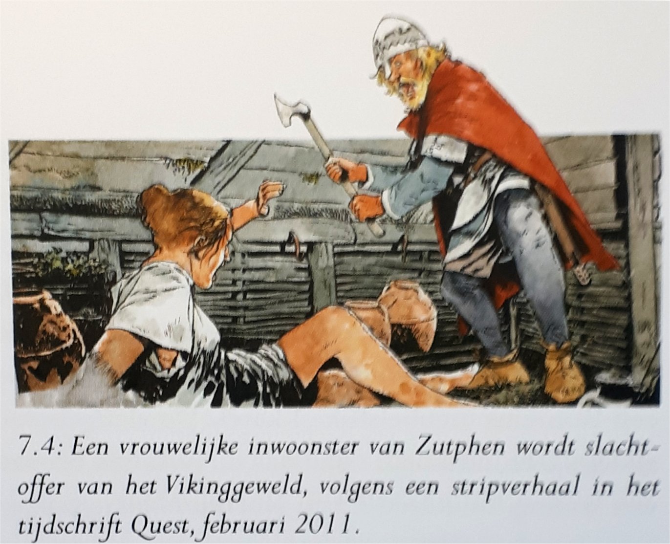 Ziet U ook dat Groothedde de aanval van de Vikingen hier vermoedelijk noemt? Ziet U ook het gat tussen 'Germaanse tijd' en de 9e eeuw? Dat gat wordt vanzelf groter aangezien de Vikingaanval uit 882 niet over Zutphen gaat, maar over het gebied van de Isla in Frans-Vlaanderen. En die menselijke resten? In zijn boek 'Een vorstelijke palts in Zutphen?' spreekt Groothedde dit zelf tegen. Zie hoofdstuk 7.1.1. Het gaat om slechts twee (2!) skeletten: van een kind van ongeveer 12 jaar en een vrouw! Slecht twee skeletten? Zijn er maar twee mensen omgekomen? Door geweld om het leven gekomen? Moord en geweld is van alle tijden, ook in huiselijke kring. Nu kun je er wel een aansprekend plaatje uit een stripboek bij plaatsen (zie afbeelding), maar fantasie is geen historische wetenschap. Hoe weet Groothedde dat het een vrouw uit Zutphen was? En die Viking? De Vikingen kwamen nooit alleen. Waarom zou hij die vrouw vermoord hebben? Was zij een bedreiging voor hem? Of wilde zij niet verkracht worden, wat toch de gebruikelijke gang van zaken was bij plunderingen van de Vikingen, oh nee, Noormannen? Met een plaatje uit een stripboek wordt hier het bewijs geleverd! Dat meent Groothedde toch zelf ook niet? En dan die munt uit York? Wat bewijs je daarmee? Dat is hetzelfde als de gevonden dakpannen uit de Romeinse tijd. Met een munt of dakpan bewijs je niet anders dan dat er mee gesjouwd en gehandeld werd. Ook in dit verhaal is nogal veel sprake van 'vermoedelijk', 'mogelijk' en 'waarschijnlijk'. De Vikingaanval op Zutphen.